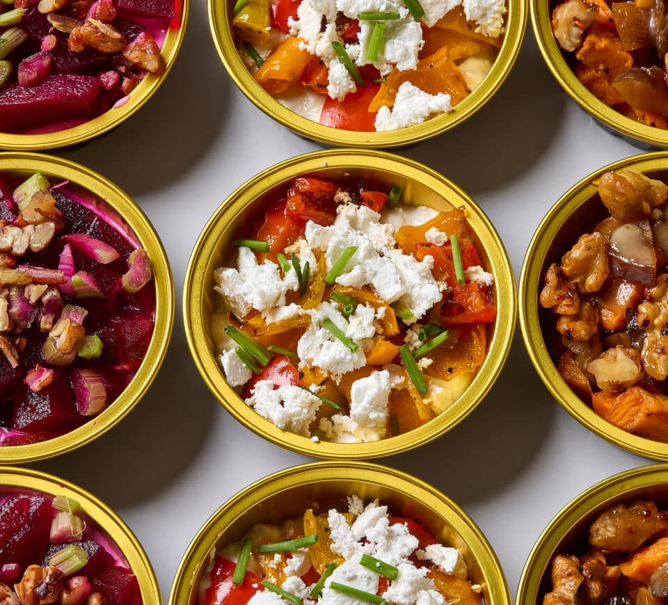 - קוביות בטטה, ערמונים מקומלים, טחינה גולמית ואגוזי מלך (טבעוני)